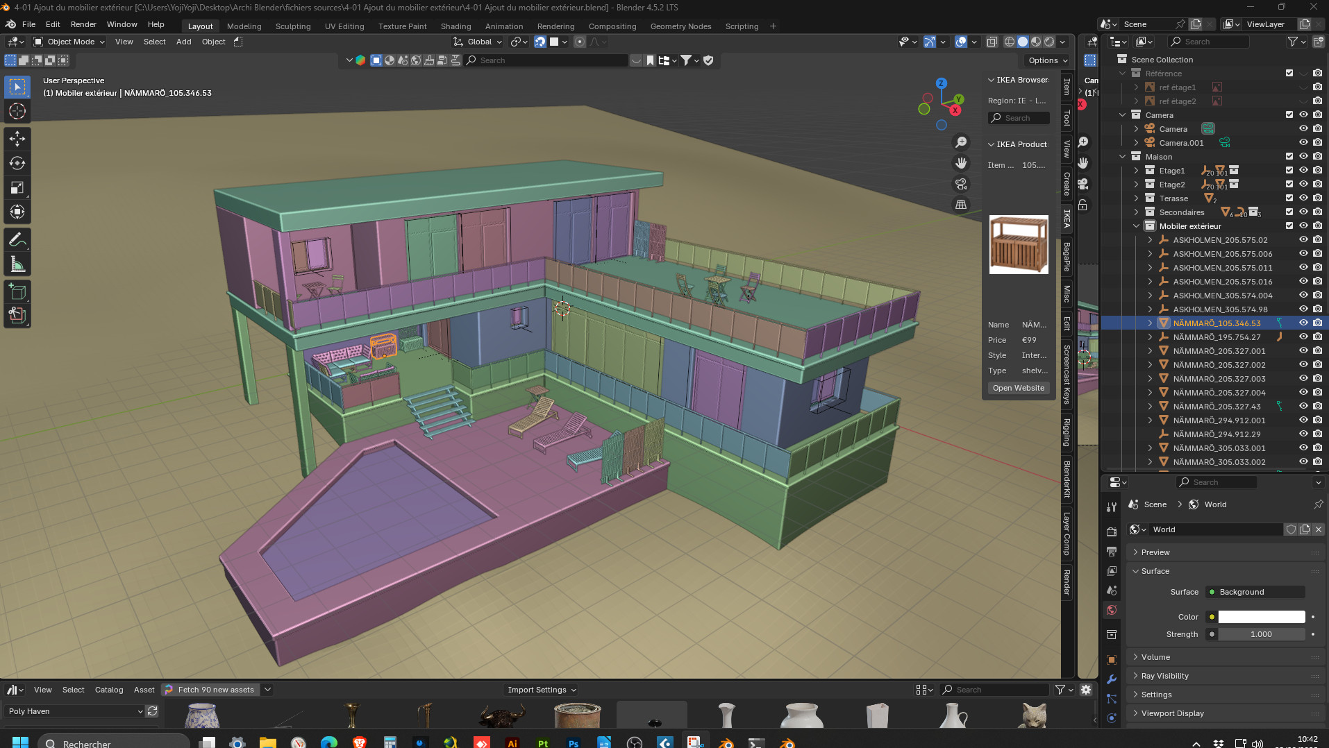 - Mobilier et décoration : ajout de meubles et éléments décoratifs intérieurs et extérieurs.