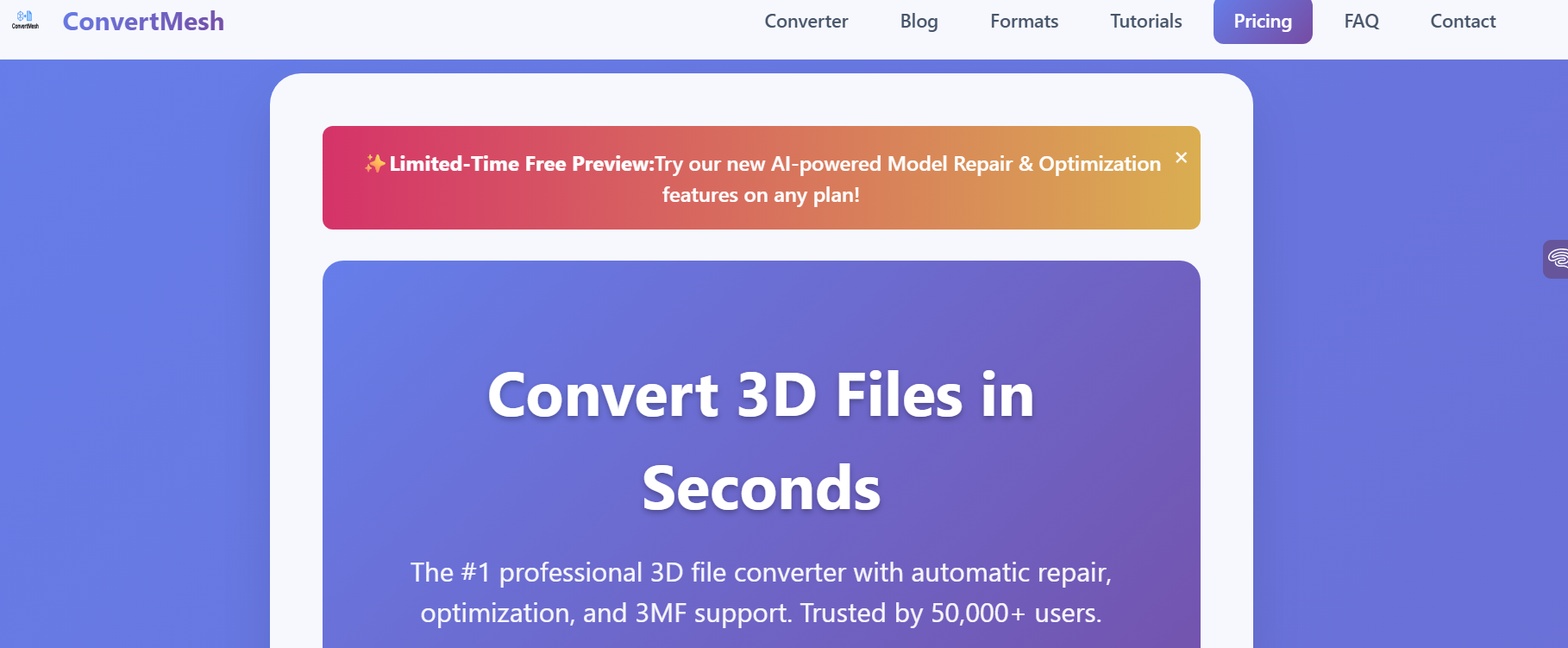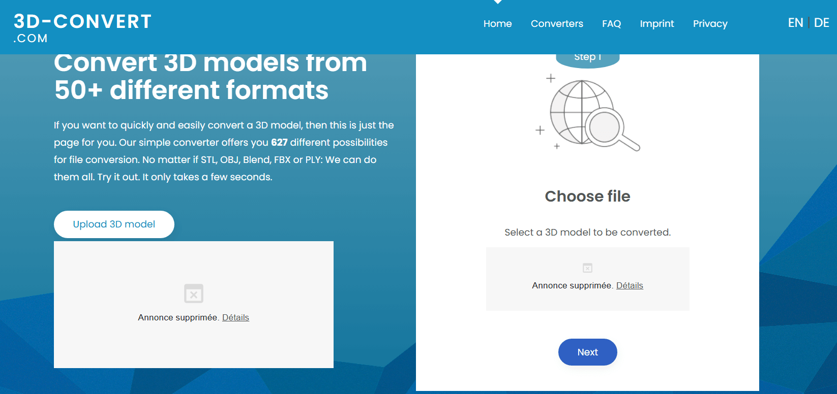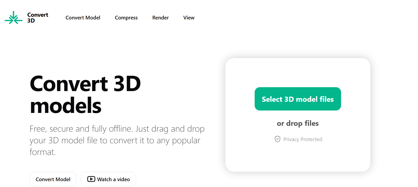 Nous commençons notre sélection de convertisseurs 3D gratuits avec un logiciel français qui prend soin de vos données. Car Convertmesh ne conserve aucun fichier sur leurs serveurs. De plus, la conversion se fait directement en ligne donc pas de téléchargement à prévoir.