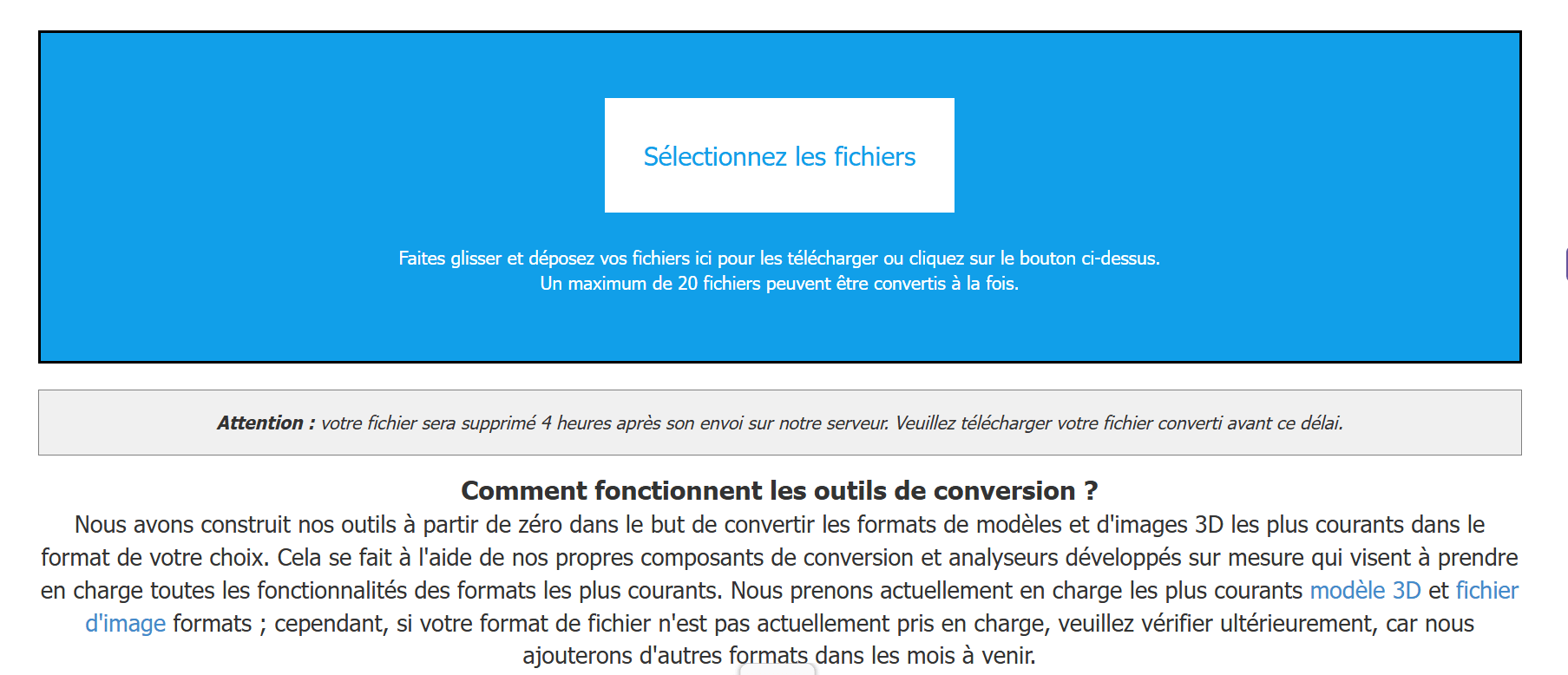 L’interface ressemble à une page web d’un convertisseur 3D lambda, pourtant vos fichiers restent sur votre pc. Ainsi aucun téléchargement dans un cloud et aucune dépendance au débit internet.