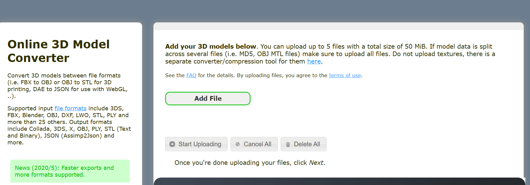 Grenntoken est un convertisseur 3D en ligne. Aucun téléchargement à prévoir. Par contre, vaut mieux avoir un débit internet suffisant. Au-delà de cet aspect, vous apprécierez de télécharger jusque 5 fichiers par conversion. Idéal quand les données d’un modèle sont réparties dans plusieurs fichiers.