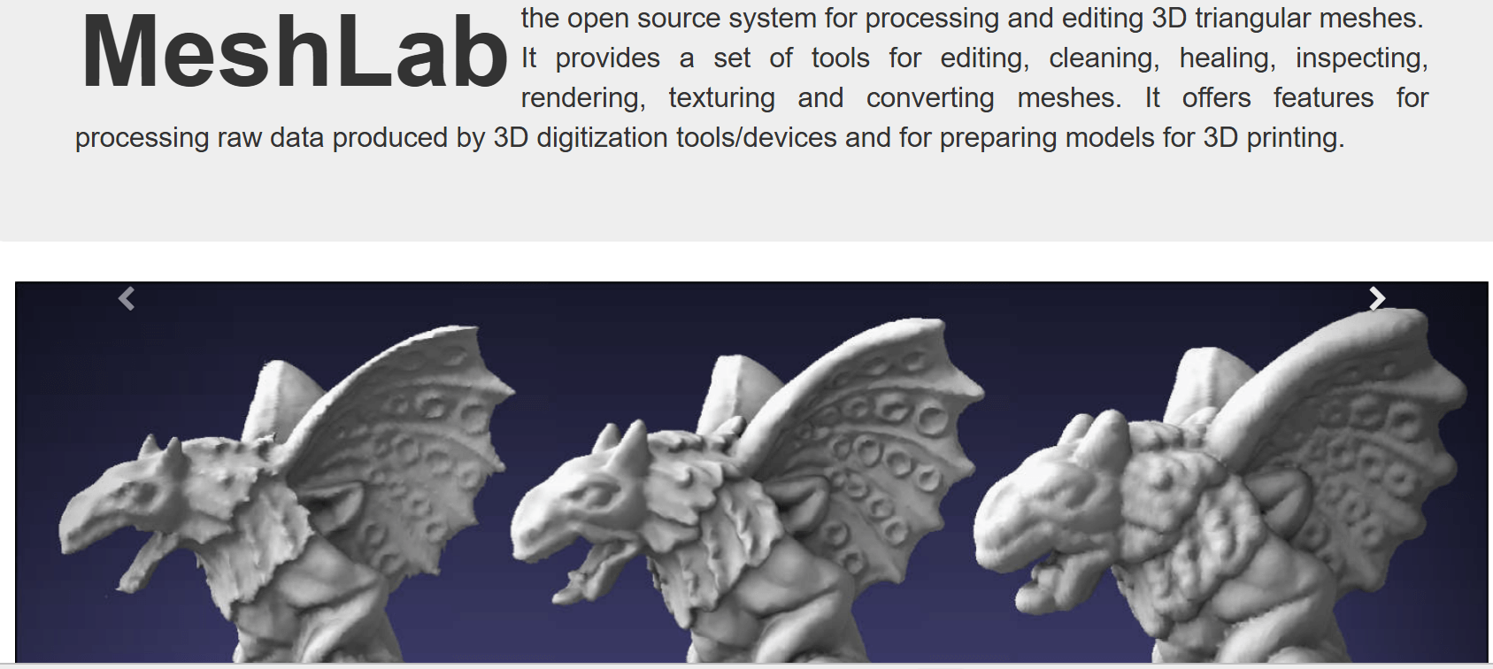Nous continuons notre sélection avec un second convertisseur 3D open source : MeshLab. Ce logiciel est en réalité un ensemble d’outils pour le traitement et l’édition de maillage 3D. Il permet d’éditer, de nettoyer, de texturer et bien sûr de convertir les fichiers 3D.