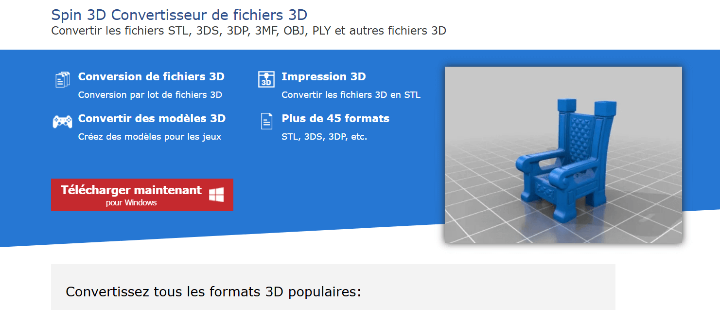 Attention, le lien de téléchargement pour la version gratuite se situe un peu plus bas sur la page, au-dessus du titre « convertir des fichiers 3D en quelques secondes ».