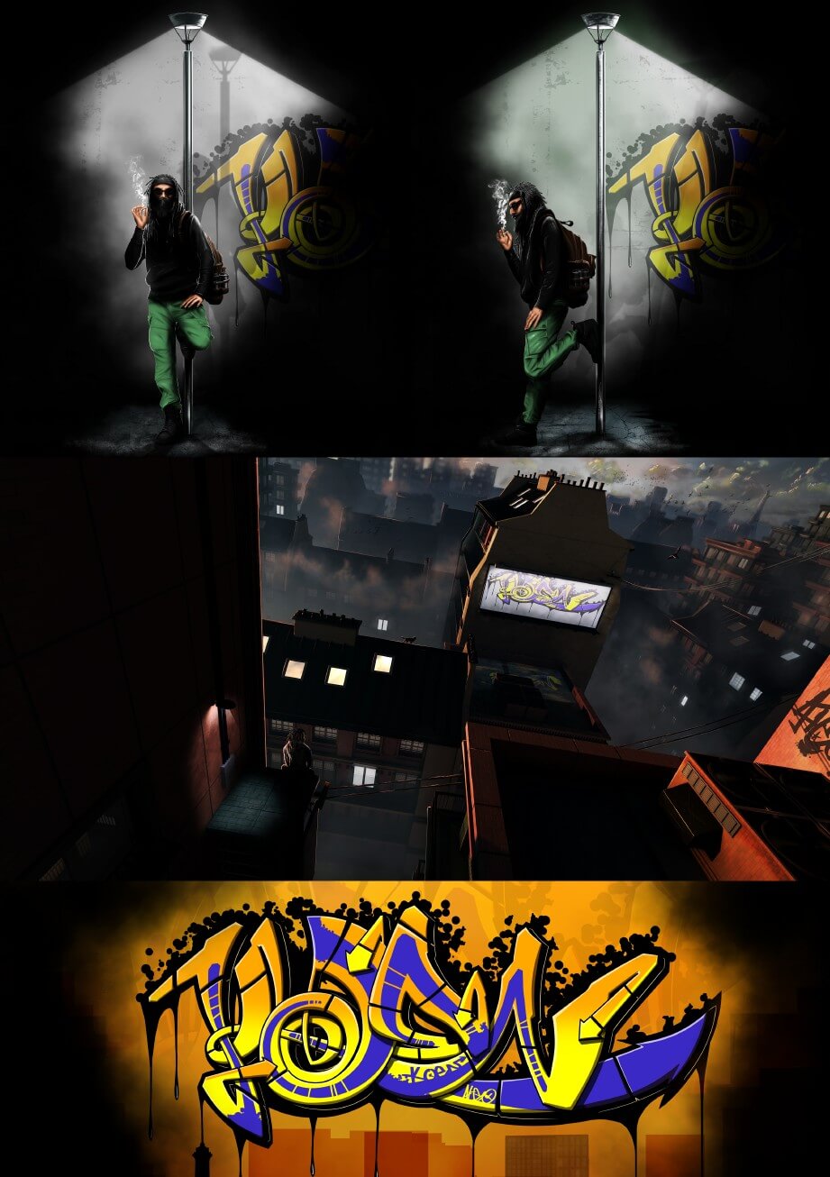 C’est une question encore un peu difficile pour moi aujourd’hui, car je suis en pleine construction du projet. Ce que je sais, c’est que j’ai envie de faire du personnage, du graffiti, de l’environnement… mais surtout, ce que j’aime par-dessus tout, c’est créer des univers, des illustrations qui racontent une histoire.