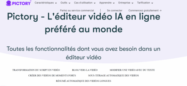 Pictory c’est l’outil vidéo des spécialistes du marketing. Il faut dire que l’IA de Pictory est redoutable. En plus d’analyser et d’extraire automatiquement les moments clés d’une vidéo longue, elle recycle les vidéos en ligne. Vous pourrez d’ailleurs ajouter directement votre marque à vos vidéos courtes.