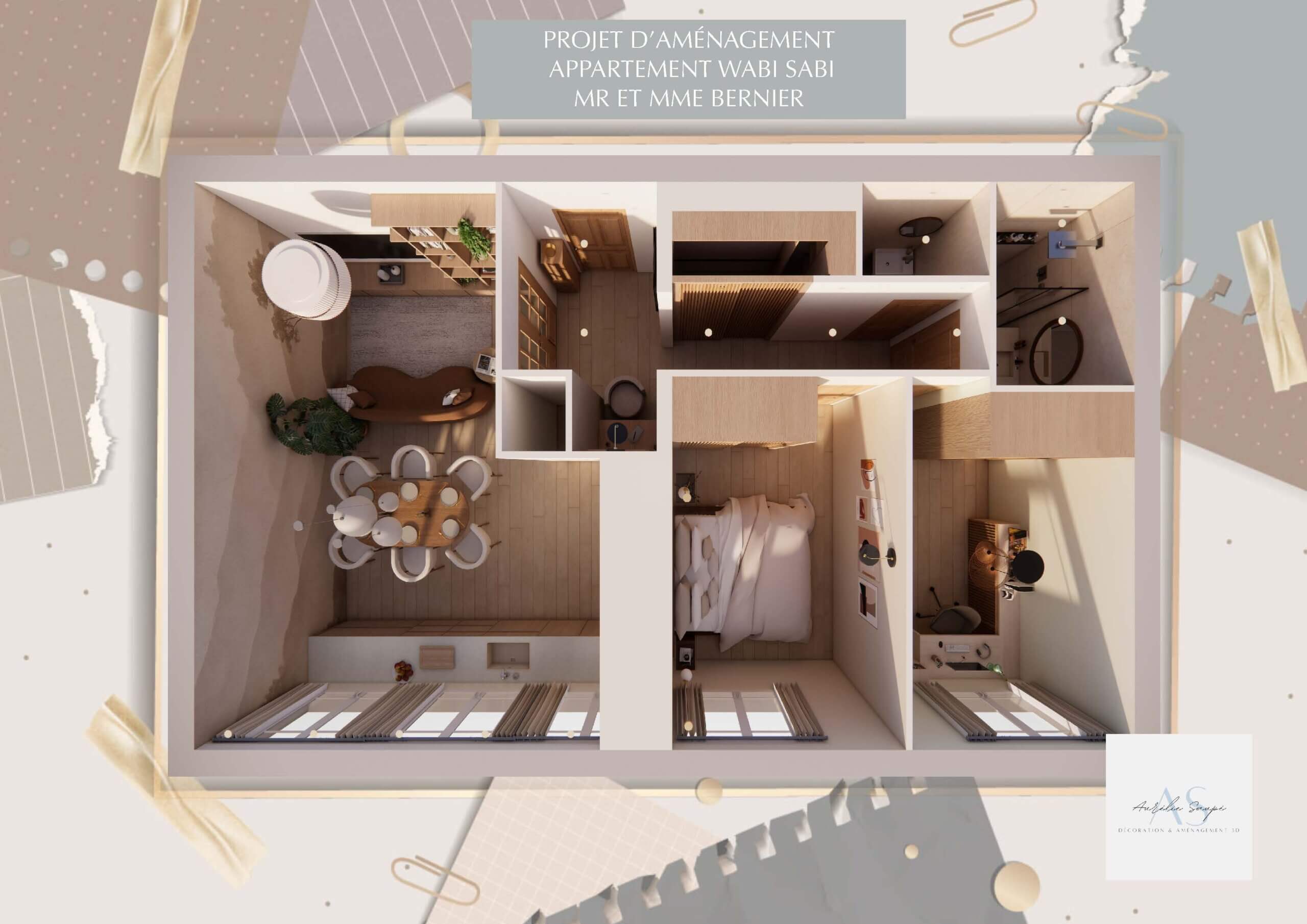 Pour le premier projet imposé, j’avais quand même une certaine liberté, qu’on ne trouve pas forcément dans la vie réelle. Il n’était pas question de budget ou autre, alors forcément cela facilite beaucoup. De ce fait, je voulais vraiment un projet fini, clé en mains. Aller jusqu’au bout de l’ambiance, du « thème ». J’ai tenté de mêler ce que moi j’aimais dans ce thème, ce qu’il était faisable de faire avec les contraintes du plan, tout en restant cohérente avec le sujet et la famille concernée par ce projet. Il était important pour moi d’essayer de montrer qu’on pouvait faire des choses différentes que ce qui se présente à nous comme une évidence au premier abord. Il y avait des indications de loisirs dans le sujet, il fallait penser l’environnement en fonction des besoins et non uniquement comme une facilité par rapport au plan. Cela m’a demandé de me creuser la tête et j’ai beaucoup aimé le côté challenge.