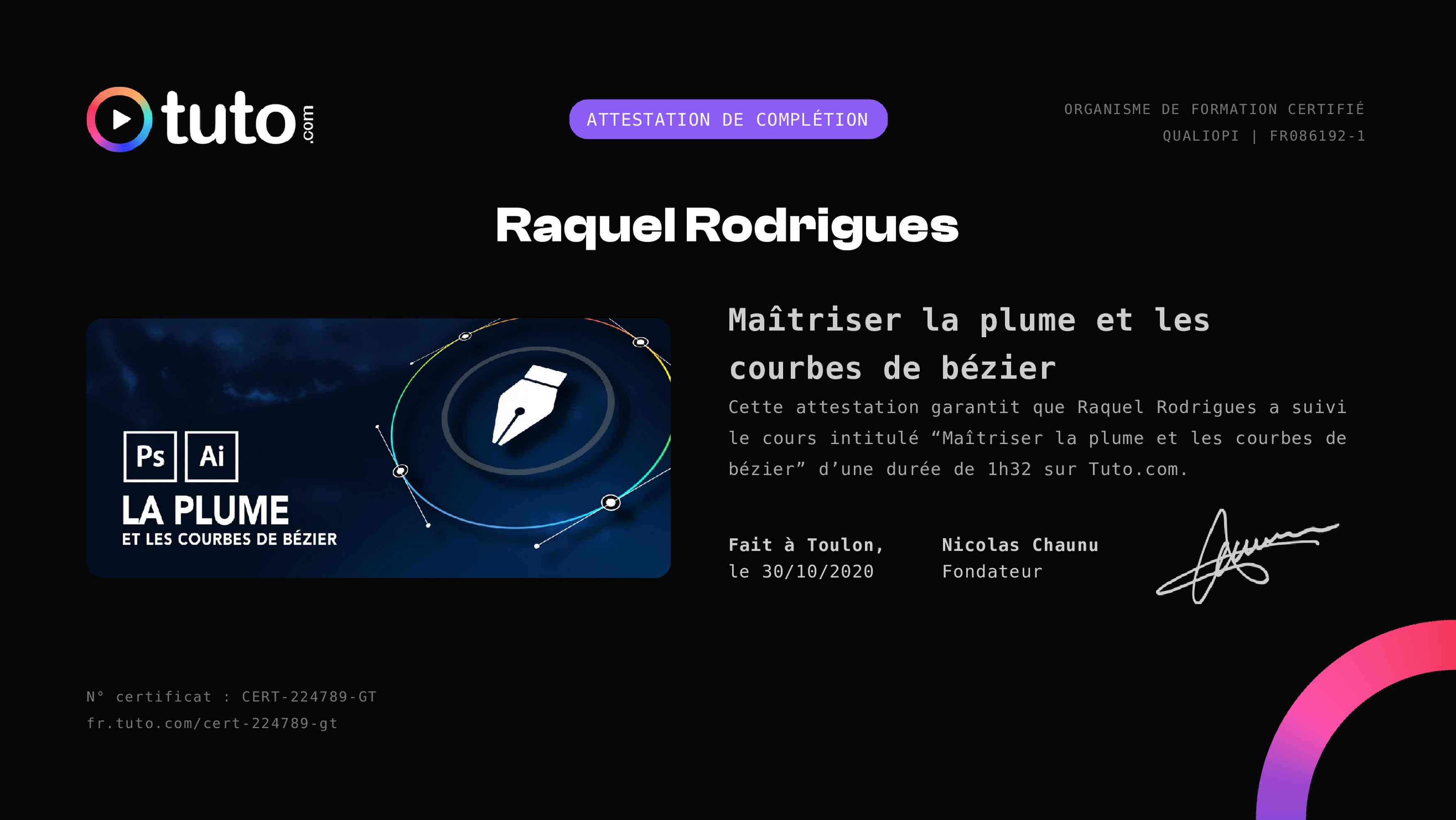 Raquel a suivi l'intégralité du cours "Maîtriser la plume et les courbes de bézier" À votre tour d'améliorer vos compétences 😊