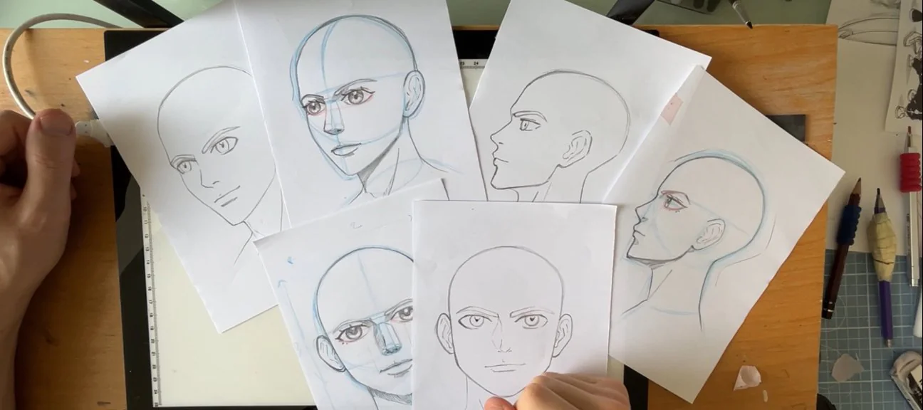 Dans ce cours d’introduction sur le dessin de la tête, façon manga, tu verras aussi bien des techniques de construction (pour avoir la bonne forme générale et les proportions) que des détails sur les traits du visage.