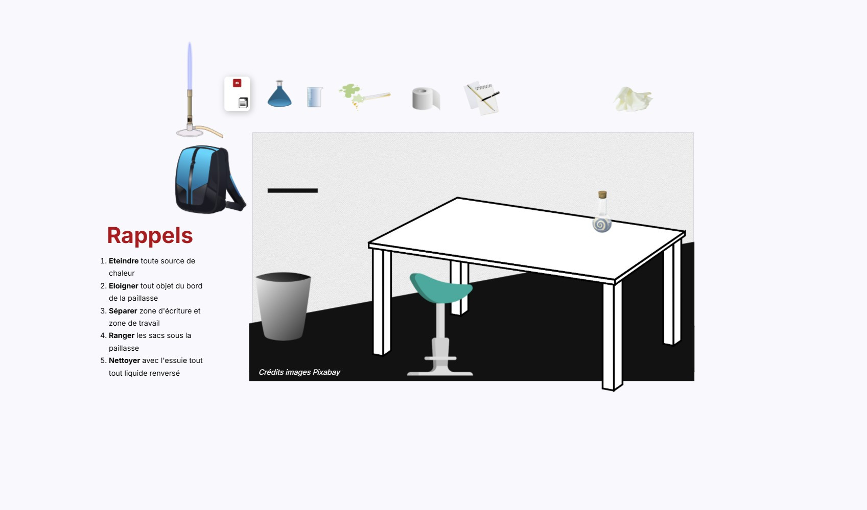 Comme la théorie prend tout son sens au travers de la pratique, ce tuto comporte un atelier. Sur la base d’un Genially source, vous concevrez un DND plus complexe s’intégrant dans une capsule de formation dédiée aux règles de sécurité dans un laboratoire