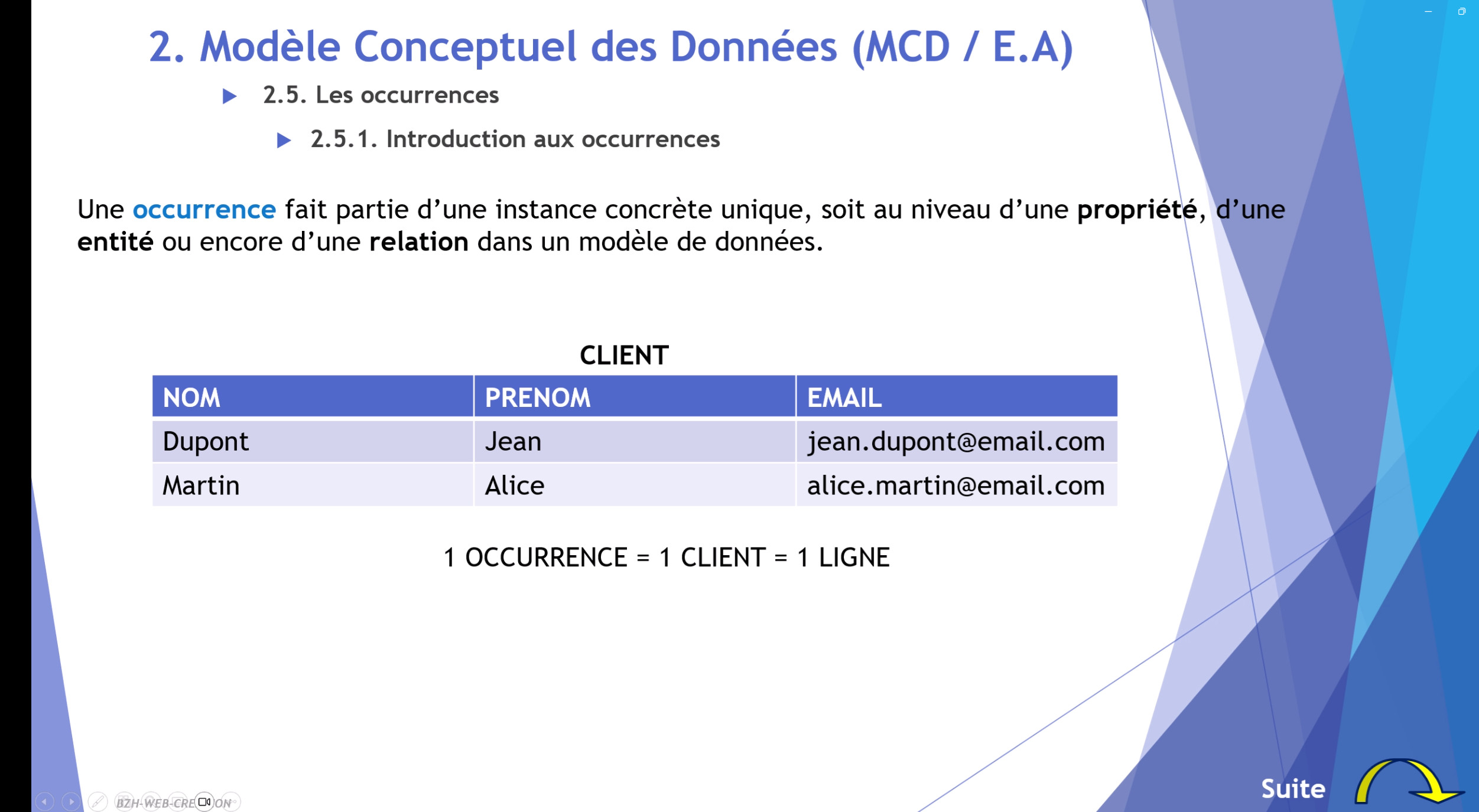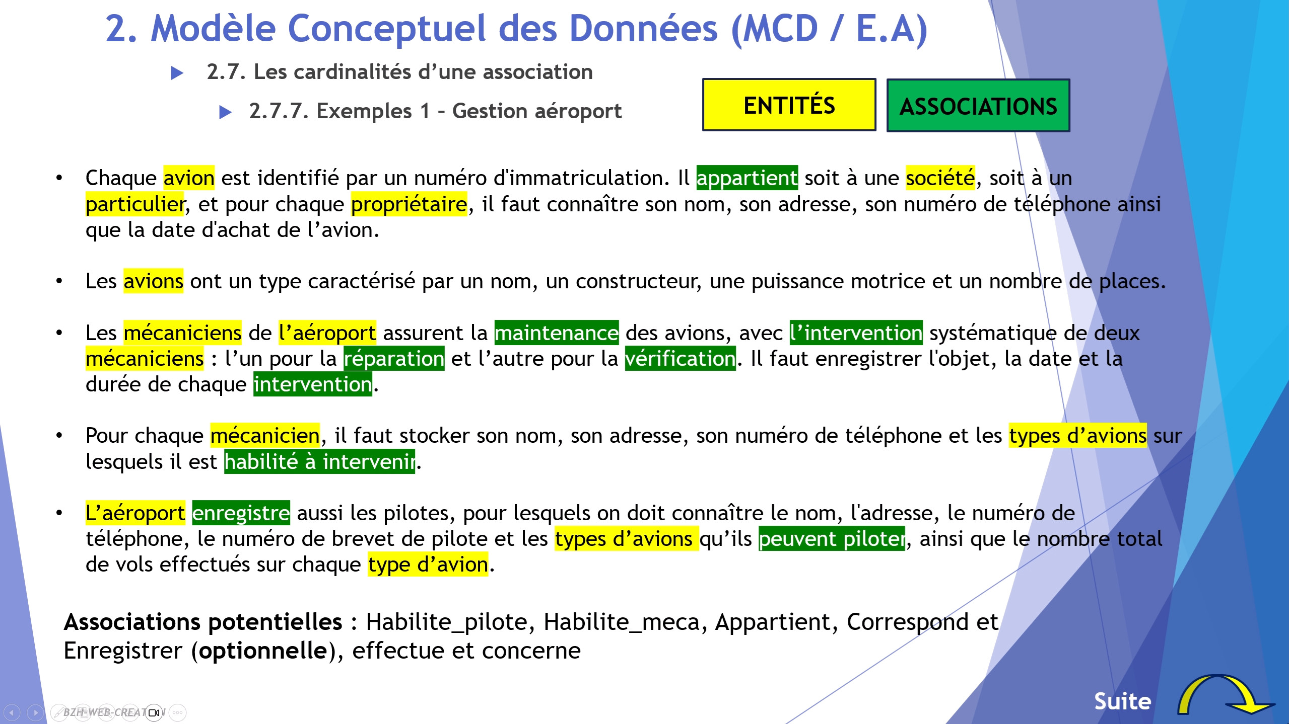 - Nous entrerons ensuite en détail dans le Modèle Conceptuel des Données (MCD). Vous apprendrez à identifier et modéliser correctement les entités, les associations, les propriétés, les identifiants et les cardinalités. Les notions plus avancées comme les contraintes d’intégrité, l’héritage et les différents types d’associations (binaires, ternaires, cycliques) seront expliquées pas à pas, avec des exemples concrets et exercices pratiques.